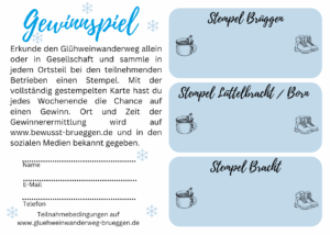 Vom 29.11. bis 21.12.2025 kann der Teilnehmer in jedem Ortsteil bei den teilnehmenden Betrieben jeweils einen Stempel auf der Stempelkarte sammeln. Die vollständig gestempelte Gewinnspielkarte kann bis spätestens 31.12.2025 in der Touristinfo (Burg Brüggen, Burgwall 4, 41379 Brüggen) oder im Rathaus (Klosterstraße 38, 41379 Brüggen) abgegeben werden. Die Burggemeinde Brüggen ermittelt die Gewinner unter allen Einsendungen am 05. Januar 2025. Die Gewinner werden telefonisch oder per E-Mail informiert. Die personenbezogenen Daten werden nach der Auslosung gelöscht und die Karten vernichtet.